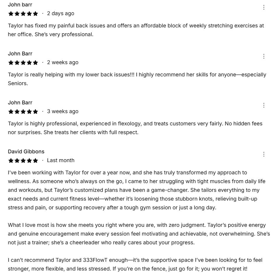 333flow/T services are designed for educational and wellness purposes only. I am a certified stretch coach and yoga instructor — not a licensed physical/occupational therapist, chiropractor, or medical provider. My sessions do not diagnose or treat medical conditions. Please consult your healthcare provider before beginning any new movement program.
