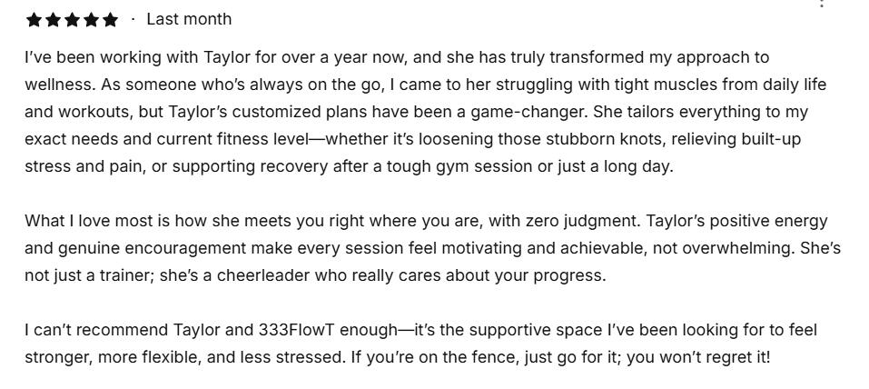 Hi, I’m Taylor — founder of 333flow/T.I created this practice to help people release tension, reset their nervous system, and feel at home in their bodies. My approach blends yoga, assisted stretching, and nutrition into one experience designed for freedom, recovery, and lasting ease.My path began in Peru in 2019, where I earned my 200‑hour internationally recognized yoga certification in both Hatha and Vinyasa.From there, I taught in college classrooms, guided clients online, and deepened my expertise with a B.S. in Nutrition & Dietetics and clinical experience in long‑term care.In 2023, I expanded into assisted stretching, training in PNF techniques and earning my YOGABODY® Stretch Coach certification in science‑backed flexibility.333flow/T is the fusion of it all — science and presence, structure and intuition — a space where movement becomes medicine for both body and mind.This work is rooted in love for movement passed down from my dad, whose quiet strength continues to guide me.Let’s find your flow.